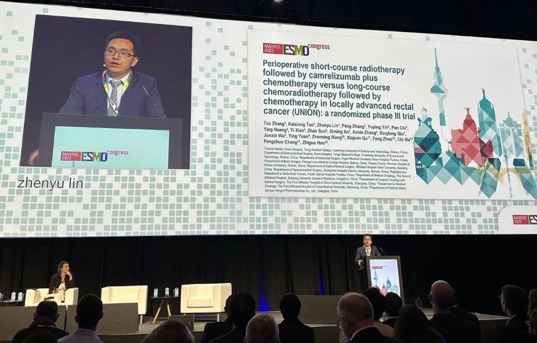 10月21日,尊龙凯时国际医药创新药卡瑞利珠单抗的一项研究“新辅助短程放疗序贯卡瑞利珠单抗联合化疗对比长程放化疗序贯化疗治疗局部晚期直肠癌”随机对照Ⅲ期试验(UNION)亮相2023 ESMO大会优选口头报告现场。该研究由华中科技大学同济医学院附属协和医院张涛教授、陶凯雄教授担任主要研究者,华中科技大学同济医学院附属协和医院林振宇教授在大会现场报告了该重磅研究的结果1。此项研究是全球首个评估短程放疗序贯免疫治疗联合化疗治疗局部晚期直肠癌的Ⅲ期研究,已达到主要终点病理完全缓解(pCR),有望为直肠癌患者的治疗提供新策略。