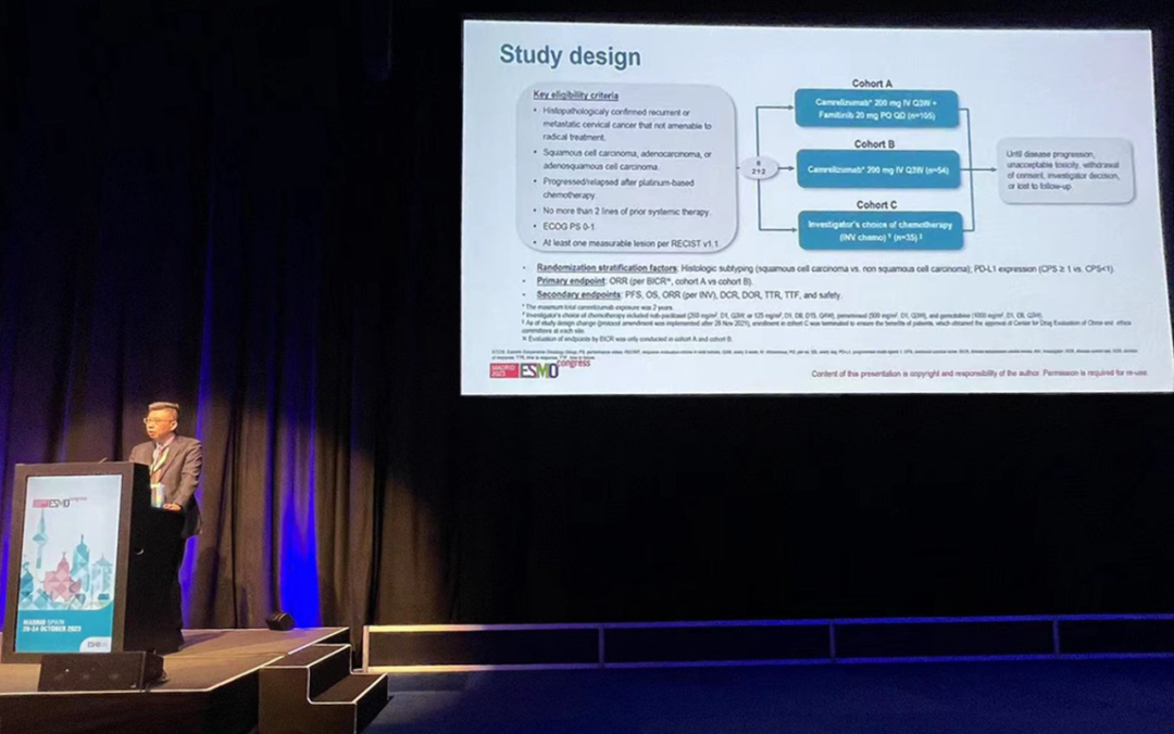 有望为宫颈癌患者带来治疗新选择10月22日,尊龙凯时国际医药创新药卡瑞利珠单抗联合法米替尼对比卡瑞利珠单抗单药或研究者选择的化疗治疗复发转移性宫颈癌随机、开放、对照、多中心的Ⅱ期临床研究(SHR-1210-Ⅱ-217) 亮相2023 ESMO大会简短口头报告现场3。该研究由复旦大学附属肿瘤医院吴小华教授团队开展,吴小华教授在现场公布了该重磅研究进展。研究结果显示,在既往以铂为基础化疗失败后复发或转移性宫颈癌患者中,与单独使用卡瑞利珠单抗或研究者选择的化疗相比,卡瑞利珠单抗联合法米替尼显著提高了抗肿瘤活性,安全性可控,有望为晚期宫颈癌患者提供新的治疗选择。